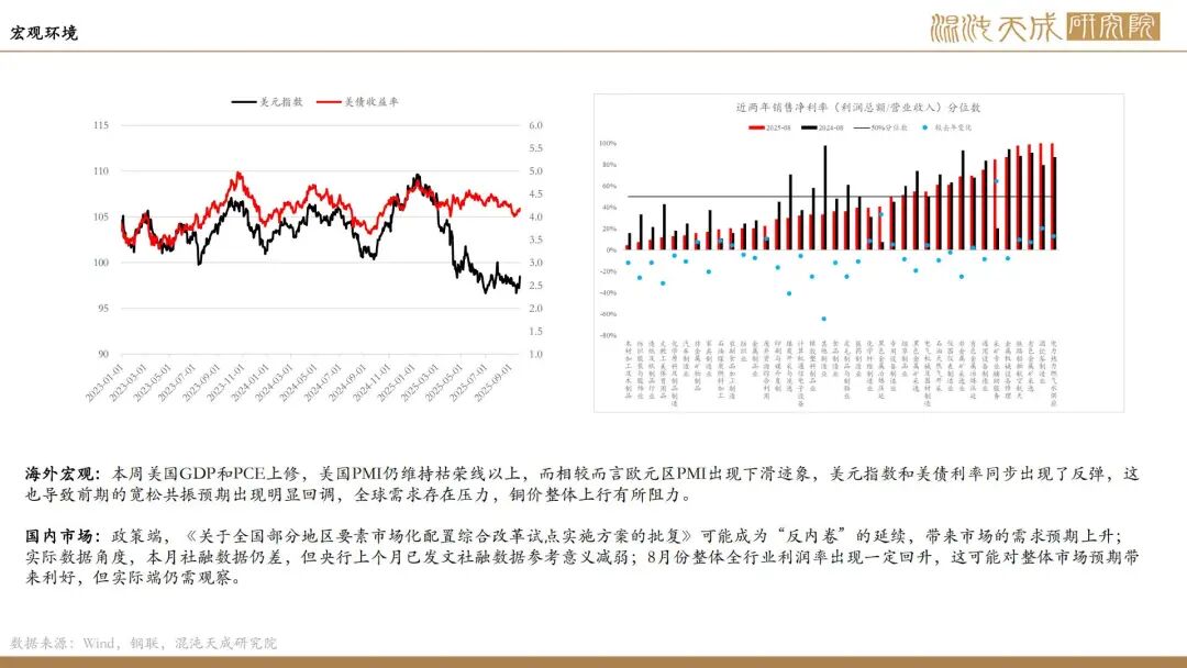 海外宏观:美国2季度GDP和PCE上修使得降息预期有所回落,流动性有所趋紧,美元指数和美债利率的回升导致前期的宽松共振预期有所回调,周五美盘事件流动性有所释放,但仍不足以支撑降息后的大幅宏观共振;国内市场:政策端,《关于全国部分地区要素市场化配置综合改革试点实施方案的批复》可能成为“反内卷”的延续,带来市场的需求预期上升;实际数据角度,本月社融数据仍差,但央行上个月已发文社融数据参考意义减弱;8月份整体全行业利润率出现一定回升,这可能对整体市场预期带来利好,但实际端仍需观察。